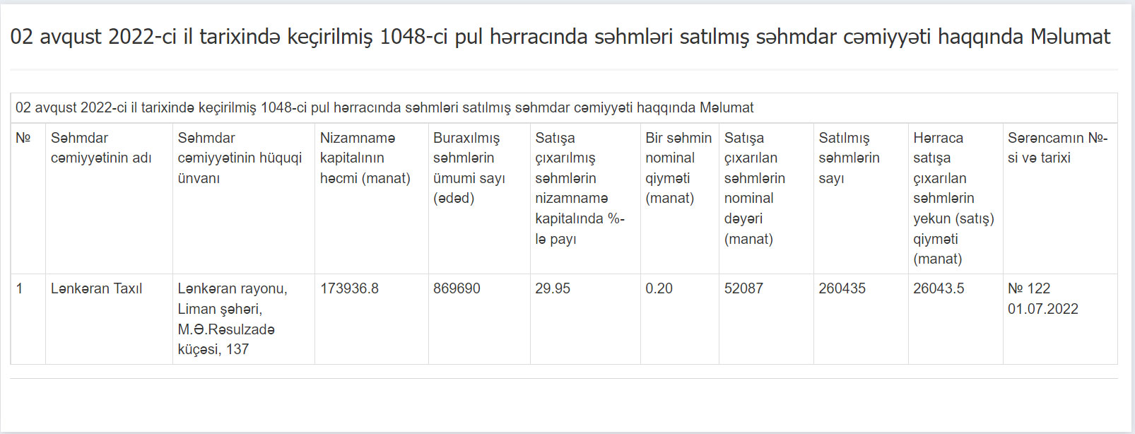 Marja xəbər verir ki, hərracda “Lənkəran Taxıl” ASC-nin dövlətə məxsus səhm paketi özəlləşdirilib. Adıçəkilən səhmdar cəmiyyətin 29,95%-lik səhm paketi 26 043 manata satılıb.