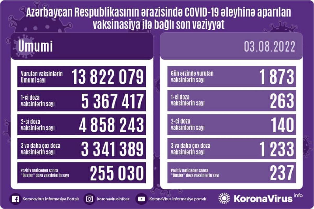 Azərbaycanda son sutkada koronavirus (COVID-19) əleyhinə 1 873 vaksin vurulub. Bir gündə birinci mərhələ üzrə vaksinasiya olunanların sayı 263, ikinci mərhələ üzrə vaksinasiya olunanların sayı 140, üç və daha çox doza üzrə vaksinasiya olunanların sayı 1 233, pozitiv nəticədən sonra buster doza üzrə vaksinasiya olunanların sayı 237 nəfərdir.