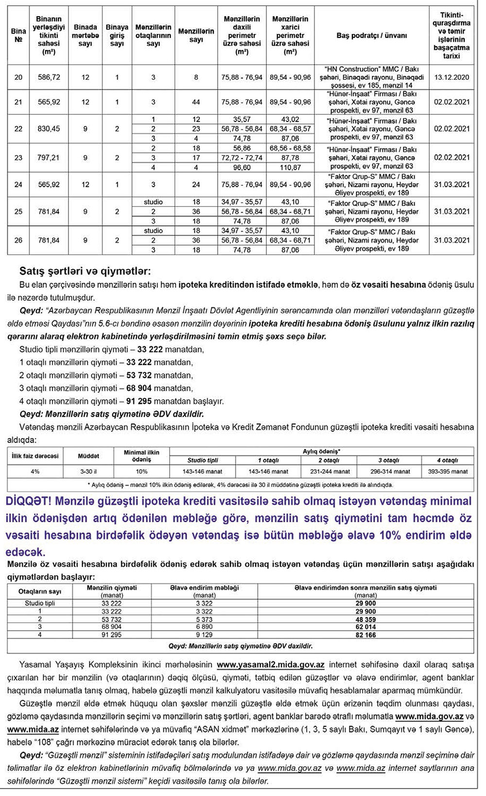 Azərbaycan Respublikasının Mənzil İnşaatı Dövlət Agentliyinin növbəti layihəsi – Yasamal Yaşayış Kompleksinin ikinci mərhələsində mənzillərin güzəştlə satışı barədə elan