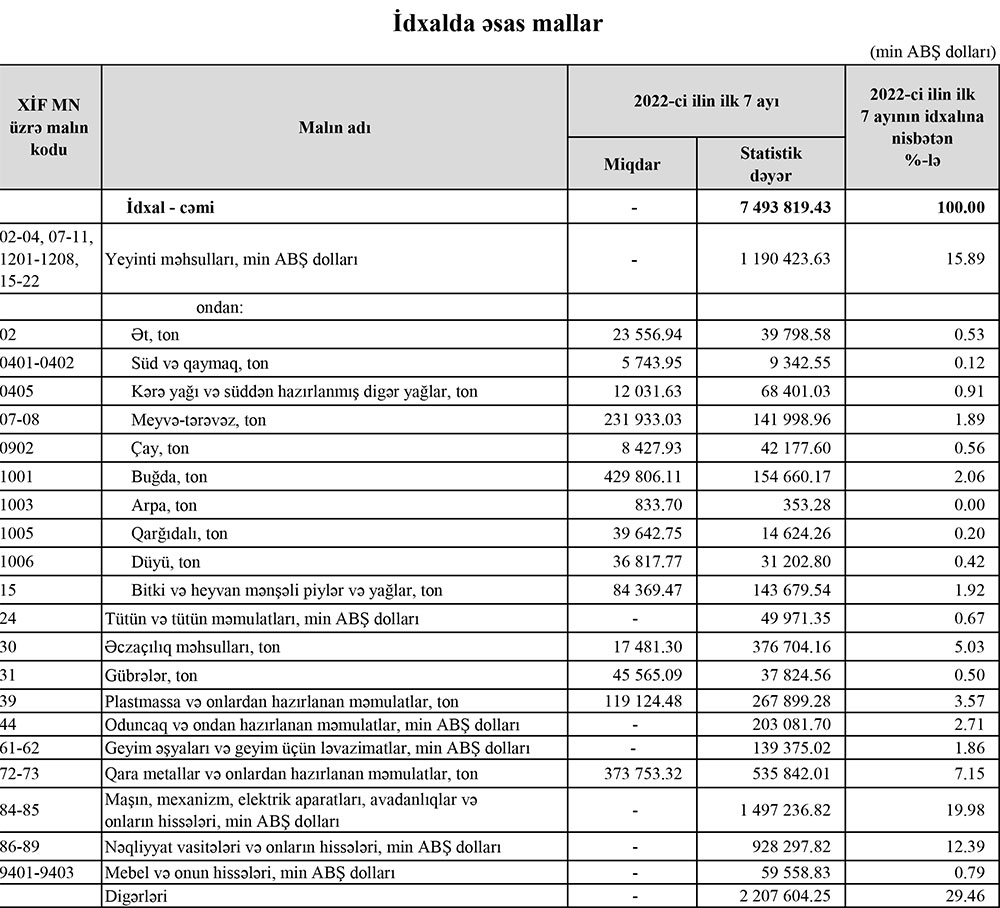 2022-ci ilin yanvar-iyul aylarında (7 ayda) Azərbaycanın ən çox ixrac və idxal etdiyi mallar açıqlanıb.