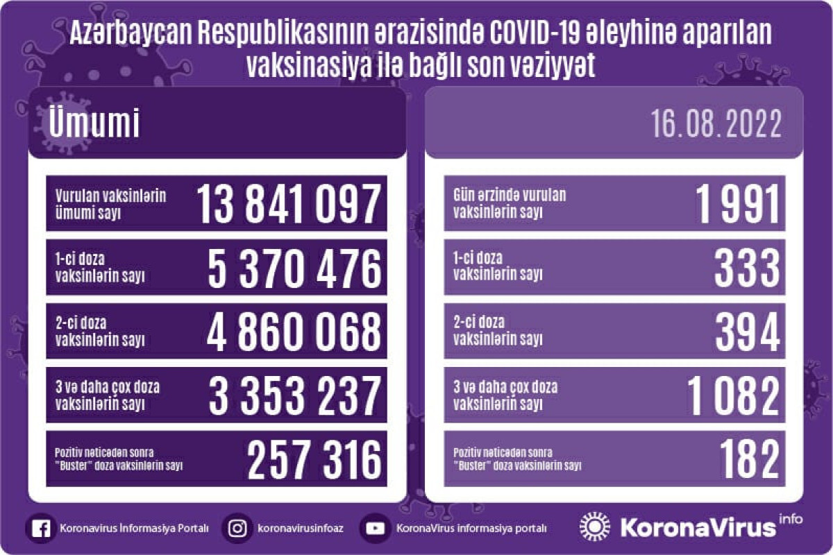 Azərbaycanda son sutkada koronavirus (COVID-19) əleyhinə 1 991 vaksin vurulub. Bir gündə birinci mərhələ üzrə vaksinasiya olunanların sayı 333, ikinci mərhələ üzrə vaksinasiya olunanların sayı 394, üç və daha çox doza vaksin vurduranların sayı 1 082, pozitiv nəticədən sonra buster doza üzrə vaksinasiya olunanların sayı isə 182 nəfərdir.
