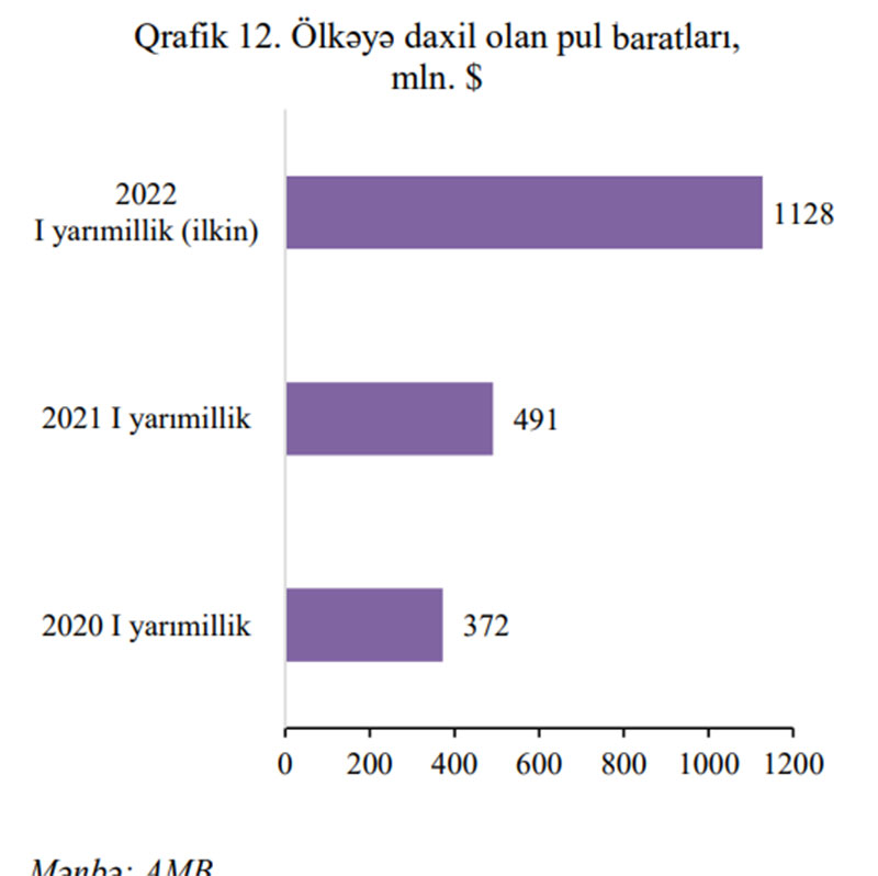 İlkin rəqəmlərə əsasən 2022-ci ilin 1-ci yarısında ölkəyə daxil olan pul baratları 2021-ci ilin müvafiq dövrü ilə müqayisədə 2.3 dəfə artaraq 1 milyard 128 milyon ABŞ dolları təşkil dib.