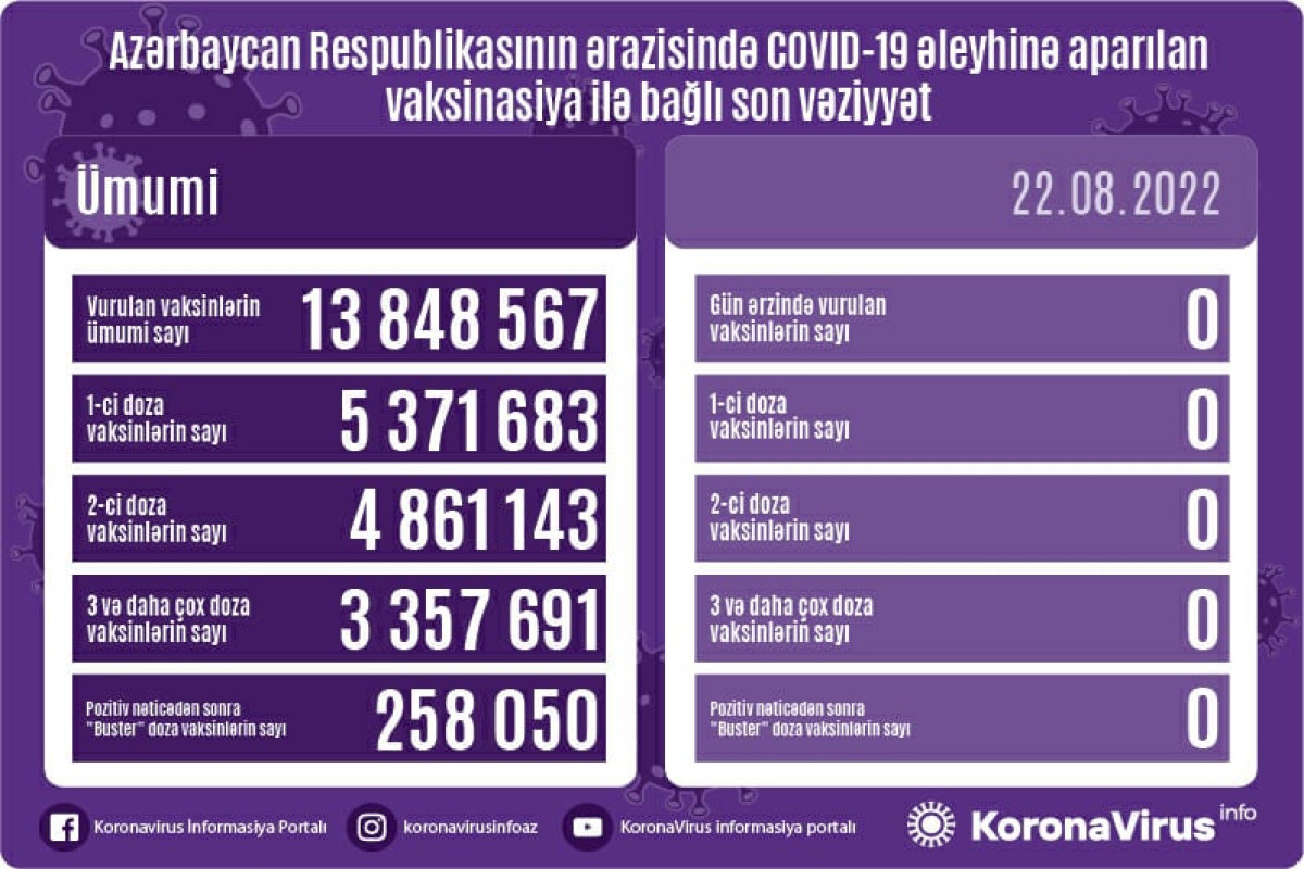 Azərbaycanda son sutkada koronavirus (COVID-19) əleyhinə vaksin vurulmayıb. Ölkədə vurulan vaksinlərin ümumi sayı 13 848 567, birinci mərhələ üzrə vaksinasiya olunanların ümumi sayı 5 371 683, ikinci mərhələ üzrə vaksinasiya olunanların sayı 4 861 143, üç və daha çox doza vaksin vurduranların sayı 3 357 691, pozitiv nəticədən sonra buster doza üzrə vaksinasiya olunanların sayı isə 258 050 təşkil edir.
