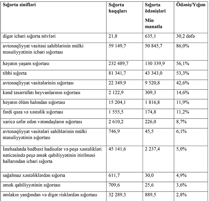 Sığorta şirkətləri üçün ən zərərli sığorta növü (digər icbari sığorta növləri çıxılmaq şərtilə) avtomobillərin icbari sığortası (NVSMMİS) olub. Sığorta şirkətləri bu sığorta növü üzrə topladıqları hər 100 manatdan 86 manatını ödənişə yönəldiblər. Həyatın yaşam sığortası üzrə ödəniş yığım nisbəti 56,1%, könüllü tibbi sığorta üzrə 53,3%, KASKO sığorta üzrə isə 42,6% təşkil edib.