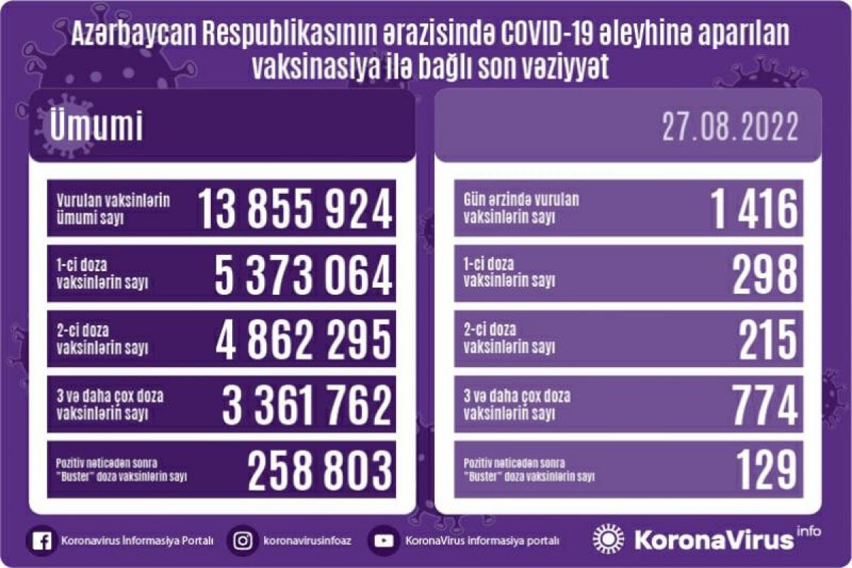 Azərbaycanda son sutkada koronavirus (COVID-19) əleyhinə 1 416 vaksin vurulub. Bir gündə birinci mərhələ üzrə vaksinasiya olunanların sayı 298, ikinci mərhələ üzrə vaksinasiya olunanların sayı 215, üç və daha çox doza vaksin vurduranların sayı 774, pozitiv nəticədən sonra buster doza üzrə vaksinasiya olunanların sayı isə 129 nəfərdir.