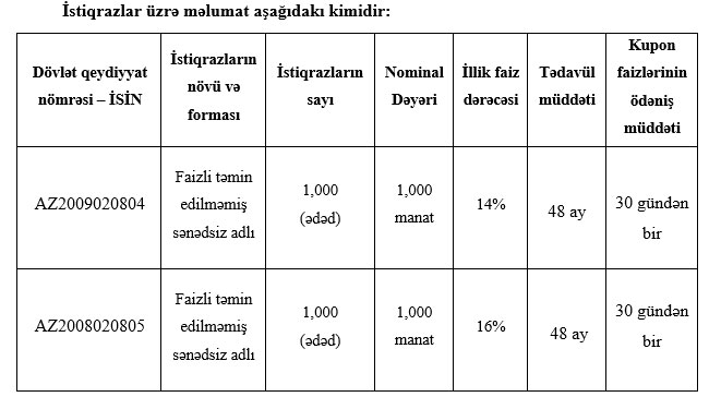 Birjanın yaydığı məlumata görə, AZ2009020804 nömrəli faizli, təmin edilməmiş, sənədsiz, adlı istiqrazların sayı 1000 ədəd, hər birinin nominal dəyəri 1000 manat, illik faiz dərəcəsi 14%, tədavül müddəti 48 ay, kupon faizlərinin ödəniş müddəti 30 gündən birdir.