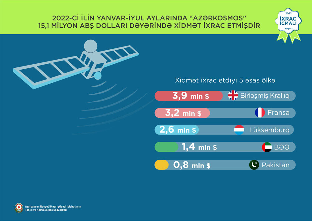 2022-ci ilin yanvar-iyul ayları ərzində peyk telekommunikasiya və optik peyk xidmətlərinin ixracının ilk beşliyində isə 3,9 milyon ABŞ dolları ilə Birləşmiş Krallıq, 3,2 milyon ABŞ dolları ilə Fransa, 2,6 milyon ABŞ dolları ilə Lüksemburq, 1,4 milyon ABŞ dolları ilə BƏƏ və 0,8 milyon ABŞ dolları ilə Pakistan qərarlaşıb.