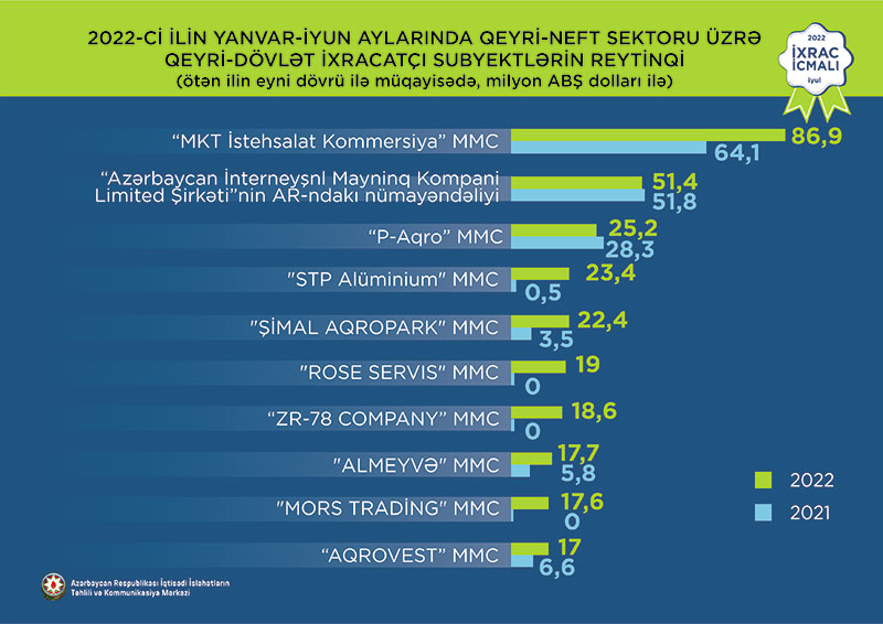 İqtisadi İslahatların Təhlili və Kommunikasiya Mərkəzi “İxrac icmalı”nın avqust sayında qeyri-neft sektoru üzrə 2022-ci ilin yanvar-iyul aylarında həyata keçirilən ixracla bağlı qeyri-dövlət ixracatçı subyektlərin reytinqi tərtib edilib.