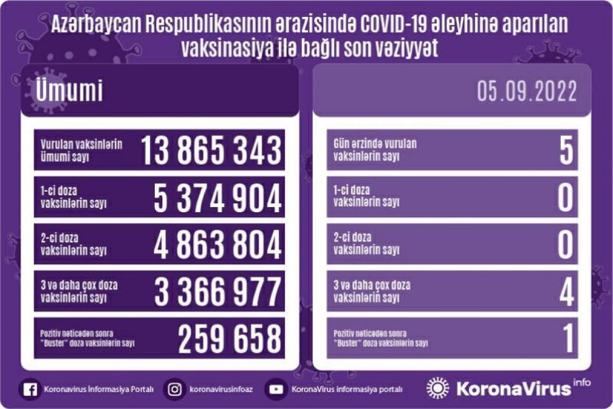 Azərbaycanda son sutkada koronavirus (COVID-19) əleyhinə 5 vaksin vurulub. Bir gündə birinci, ikinci mərhələlər üzrə vaksinasiya olunan olmayıb. Üç və daha çox doza üzrə vaksinasiya olunanların sayı 4, pozitiv nəticədən sonra buster doza üzrə vaksinasiya olunanların sayı 1 nəfərdir.