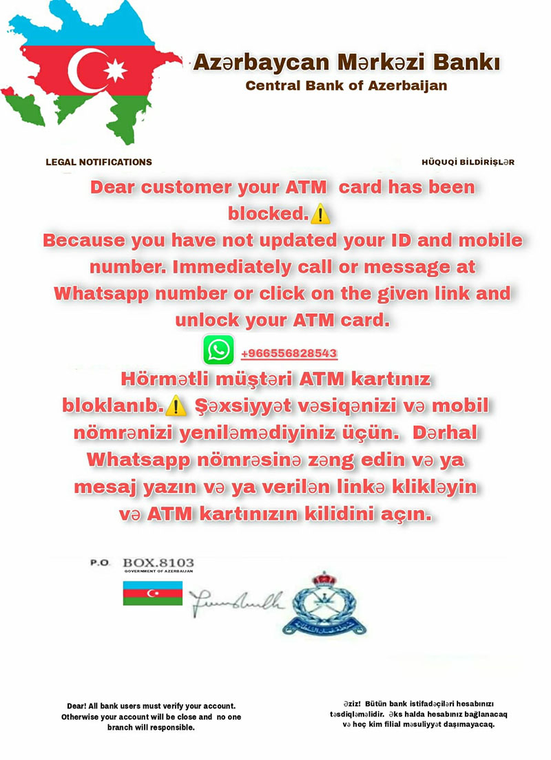Vətəndaşlarımızı bu kimi məsələlərdə ehtiyatlı olmağa, şəxsi və ödəniş kartı haqda məlumatları heç bir halda üçüncü şəxslərə təqdim etməməyə və lazımi məlumatları yalnız Azərbaycan Respublikası Mərkəzi Bankının rəsmi internet səhifəsi və ya rəsmi sosial şəbəkə hesablarından əldə etməyə çağırırıq.