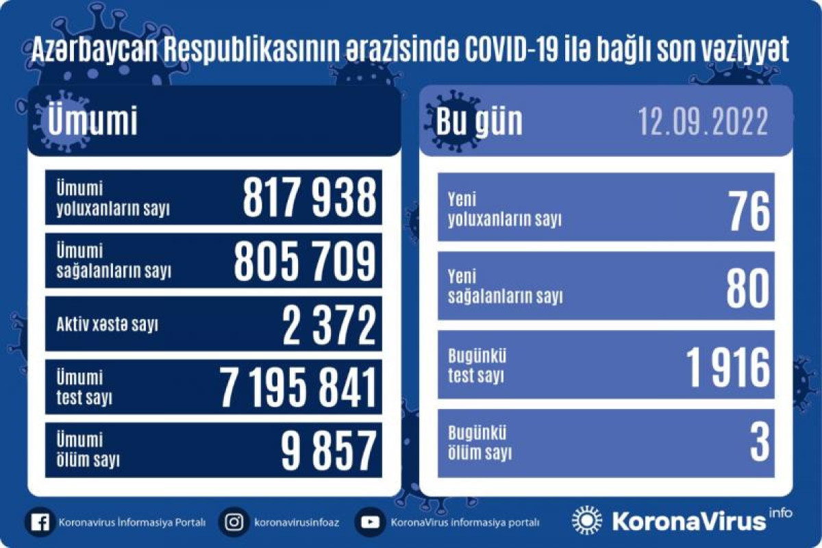Son sutkada Azərbaycanda 76 nəfər koronavirusa yoluxub, 3 nəfər ölübAzərbaycan Respublikasında koronavirus (COVID-19) infeksiyasına 76 yeni yoluxma faktı qeydə alınıb, 80 nəfər müalicə olunaraq sağalıb.