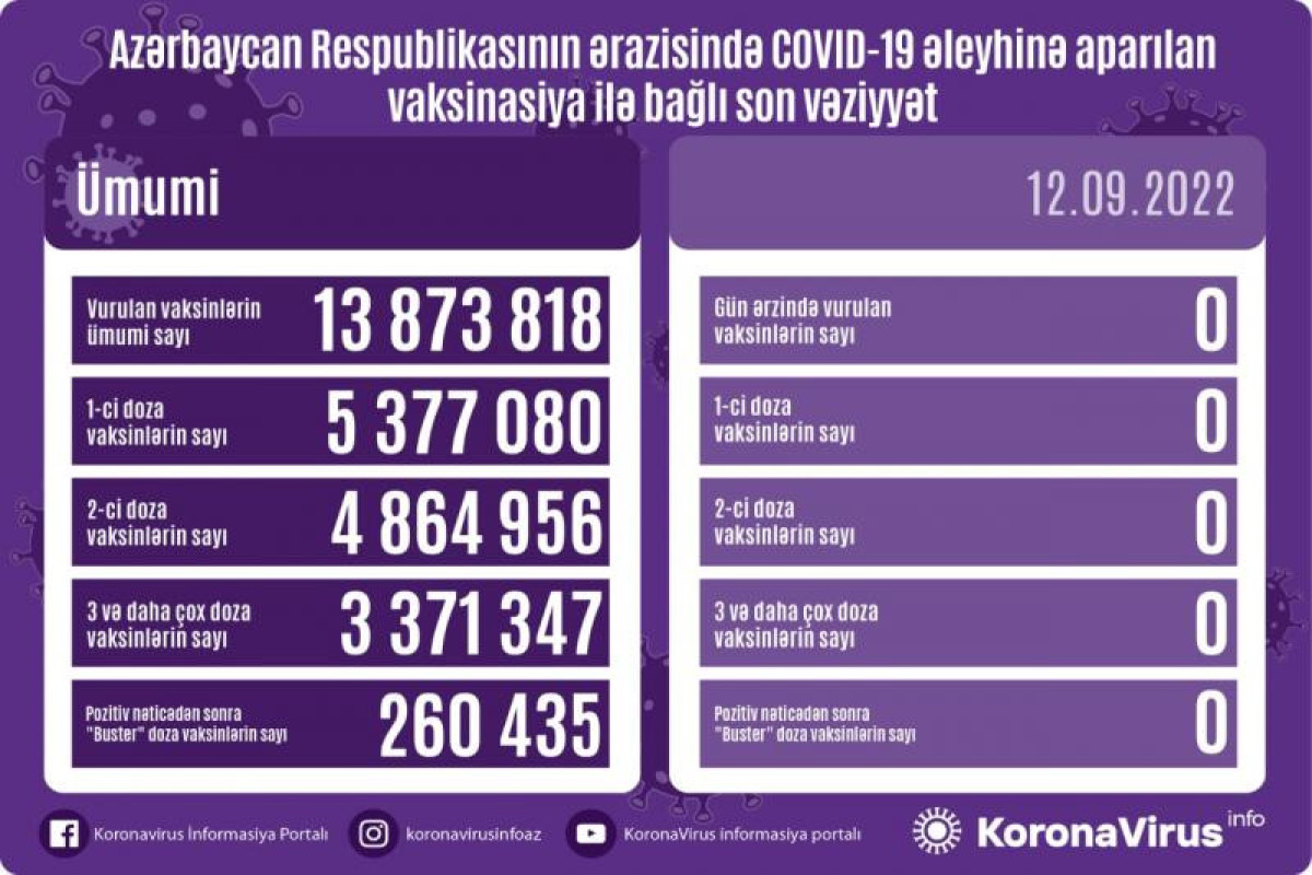 Azərbaycanda son sutkada koronavirus (COVID-19) əleyhinə vaksin vurulmayıb. Otən gün müxtəlif mərhələlər üzrə vaksinasiya olunanlar qeydə alınmayıb.
