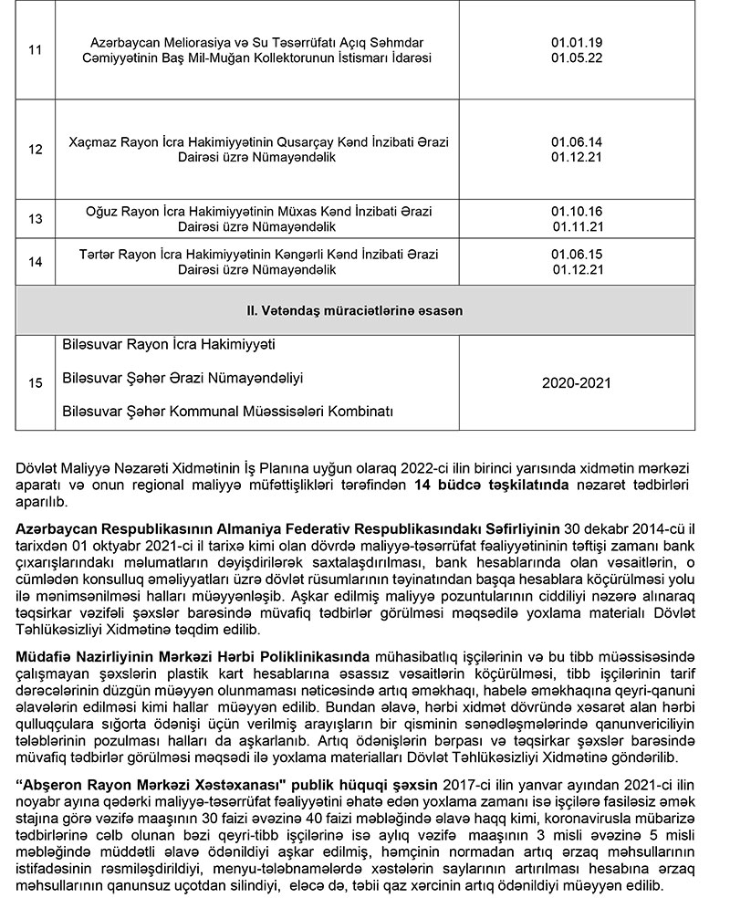 Xidmətin mərkəzi aparatı və onun regional maliyyə müfəttişlikləri tərəfindən 2022-ci il üçün təsdiq olunmuş iş planına əsasən 2022-ci ilin birinci yarısında 14 təşkilatda aparılmış yoxlamalarla aşkar olunmuş 2 milyon 919,4 min manat məbləğində artıq və əsassız ödənişlərin 108,0 min manat hissəsinin yoxlamaların gedişində və yoxlamalardan sonrakı dövrdə təqsirkar şəxslər tərəfindən dövlət büdcəsinə ödənilərək bərpası təmin edilmiş, həmin nəzarət obyektlərindən 2 təşkilat üzrə aşkar olunmuş 2 milyon 811.4 min manat məbləğində nöqsanlara hüquqi qiymət verilməsi üçün yoxlama materialları Dövlət Təhlükəsizliyi Xidmətinə göndərilmişdir.