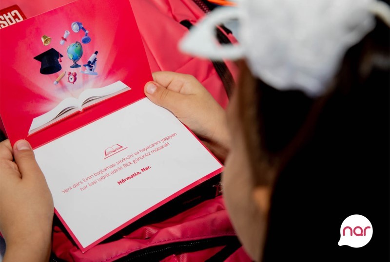 “Nar” artıq bir neçə ildir ki, korporativ sosial məsuliyyət (KSM) strategiyası çərçivəsində Azərbaycanın müxtəlif bölgələrində təhsil alan şagirdlərin məktəb həyatına ilk addımlarını dəstəkləyir. Məqsəd bölgələrdə təhsil alan şagirdlərin ailələrinə dəstək olmaq və şagirdlərə dərslərində daha da uğurlu olmaları üçün stimul verməkdir.
