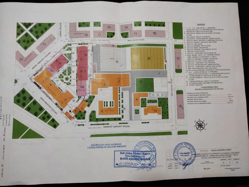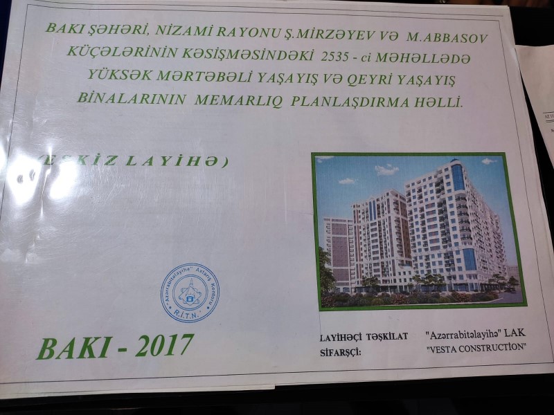 "Məlumat üçün bildiririk ki, Bakı şəhəri, Nizami rayonunun sosial-iqtisadi inkişafının sürətləndirilməsinə dair əlavə tədbirlər barədə Azərbaycan Respublikası Nazirlər Kabinetinin 2016-cı il 25 fevral tarixli 86 №-li Qərarına əsasən Ş.Mirzəyev və M.Abbasov küçələrinin kəsişməsində, 2535-ci məhəllədəki torpaq sahəsində mövcud bina və qurğuların sökülərək, yerində çoxmərtəbəli yaşayış binalarının və qeyri-yaşayış obyektlərinin tikintisinin layihələndirilməsi üçün torpaq sahəsi icarə əsasında Bakı şəhəri Nizami Rayon İcra Hakimiyyəti başçısının 10.03.2016-cı il tarixli, 29 №-li Sərəncamı ilə “Vesta Construction” MMC-nin istifadəsinə verilmişdir.