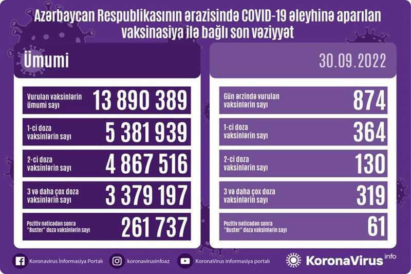 Vurulan vaksinlərin ümumi sayı 13 890 389, birinci mərhələ üzrə vaksinasiya olunanların ümumi sayı 5 381 939, ikinci mərhələ üzrə vaksinasiya olunanların sayı 4 867 516, üç və daha çox doza üzrə vaksinasiya olunanların sayı 3 379 197, pozitiv nəticədən sonra buster doza üzrə vaksinasiya olunanların sayı isə 261 737 nəfər təşkil edir.