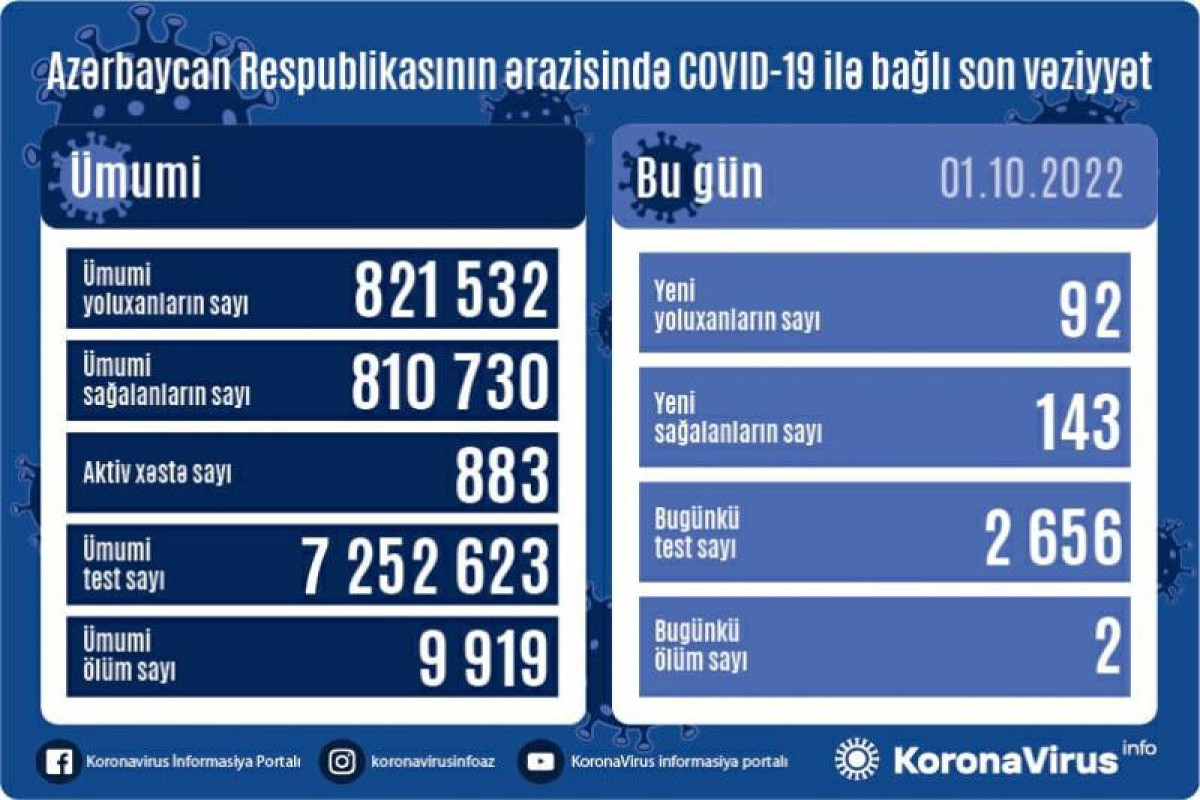 Azərbaycan Respublikasında koronavirus (COVID-19) infeksiyasına 92 yeni yoluxma faktı qeydə alınıb, 143 nəfər müalicə olunaraq sağalıb. COVID-19 üçün götürülən analiz nümunələri müsbət çıxmış şəxslərdən 2 nəfəri vəfat edib.
