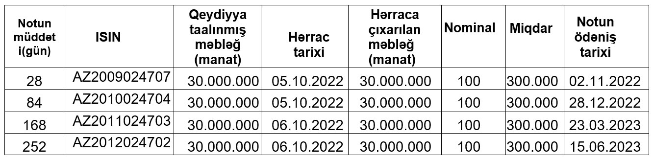 5 və 6 oktyabr 2022-ci il tarixlərində Bakı Fond Birjasında Azərbaycan Respublikasının Mərkəzi Bankının notlarının yerləşdirilməsi üzrə hərrac keçiriləcəkdir.