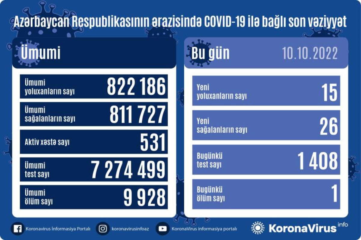 Azərbaycan Respublikasında koronavirus (COVID-19) infeksiyasına 15 yeni yoluxma faktı qeydə alınıb, 26 nəfər müalicə olunaraq sağalıb.
