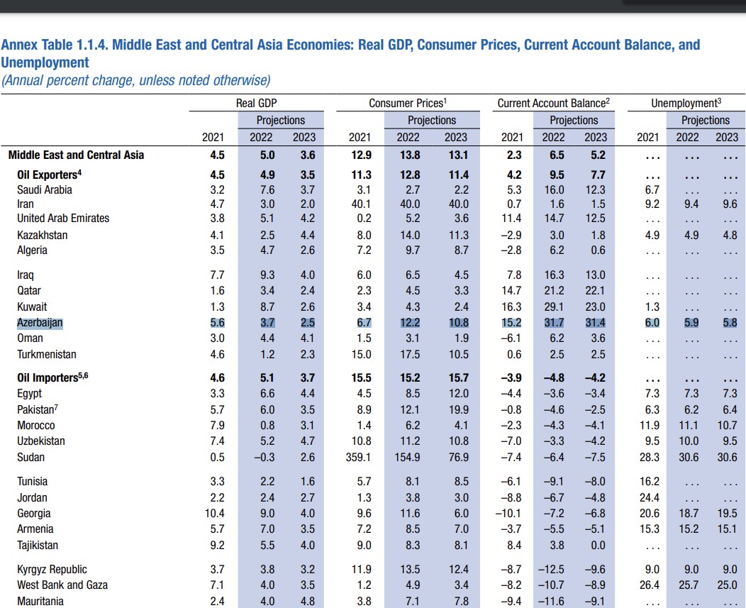 BVF İyul ayında Azərbaycan iqtisadiyyatının 2022-ci ildə 3.8%, 2023-cü ildə isə 2,6% artacağını gözləyirdi. Beləliklə, Fond Azərbaycan iqtisadiyyatının artımı ilə bağlı 2022-ci il üzrə proqnozunu 0,1 faiz bəndi və 2023-cü il üzrə proqnozunu da 0,1 faiz bəndi pisləşdirib.
