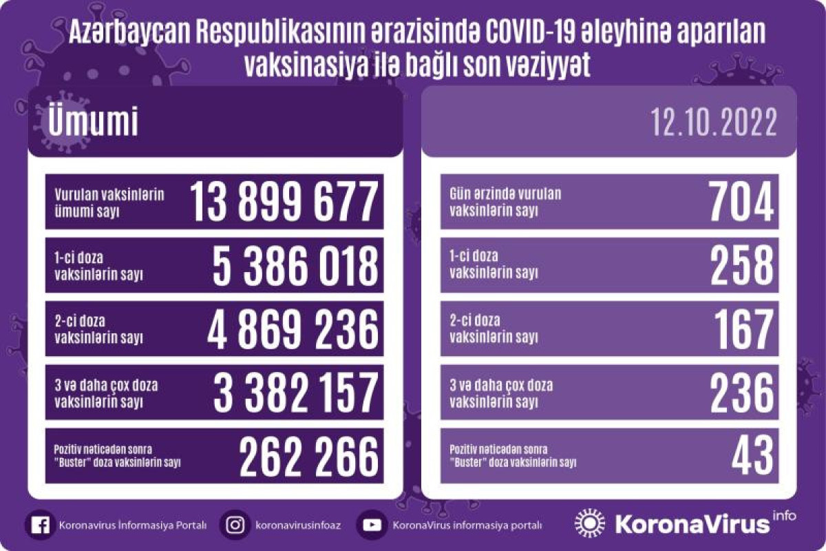 Azərbaycanda son sutkada koronavirus (COVID-19) əleyhinə 704 vaksin vurulub. Bir gündə birinci mərhələ üzrə vaksinasiya olunanların sayı 258, ikinci mərhələ üzrə vaksinasiya olunanların sayı 167, üç və daha çox doza üzrə vaksinasiya olunanların sayı 236, pozitiv nəticədən sonra buster doza üzrə vaksinasiya olunanların sayı 43 nəfərdir.