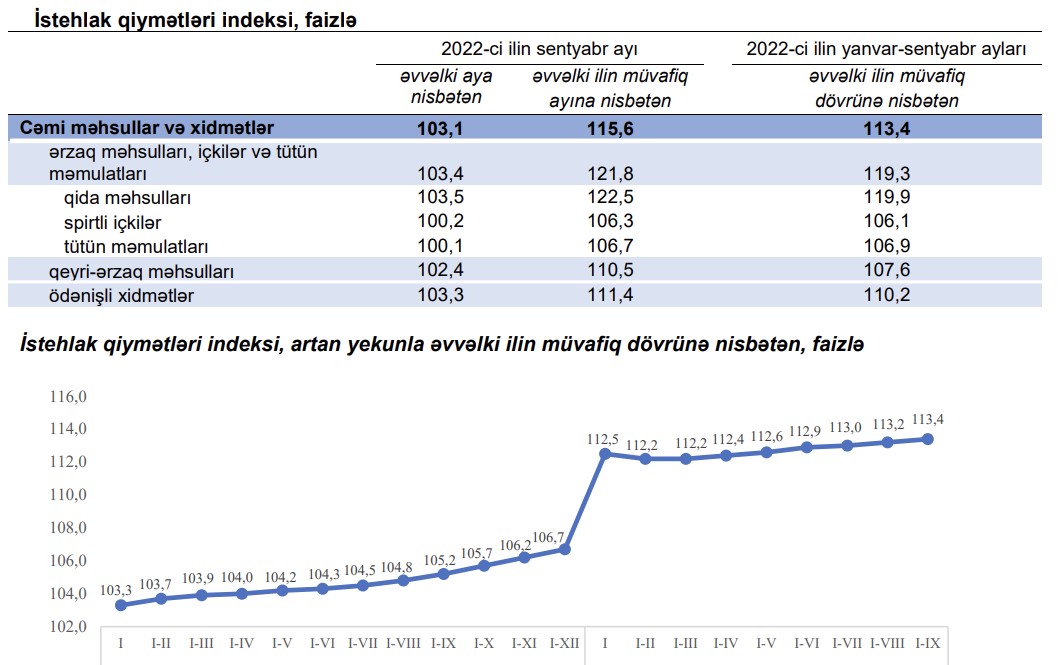 Azərbaycanda 9 aylıq inflyasiya 13,2%-dən 13,4%-ə, 12 aylıq inflyasiya 14,2%-dən 15,6%-ə, ərzaq inflyasiyası isə 20,8%-dən 21,8%-ə qalxıb.2022-ci ilin yanvar-sentyabr aylarında istehlak qiymətləri indeksi (inflyasiya göstəricisi) 2021-ci ilin yanvar-sentyabr aylarına nisbətən 13,4 faiz, o cümlədən ərzaq məhsulları, içkilər və tütün məmulatları üzrə 19,3 faiz, qeyri-ərzaq məhsulları üzrə 7,6 faiz, əhaliyə göstərilmiş ödənişli xidmətlər üzrə 10,2 faiz artıb.