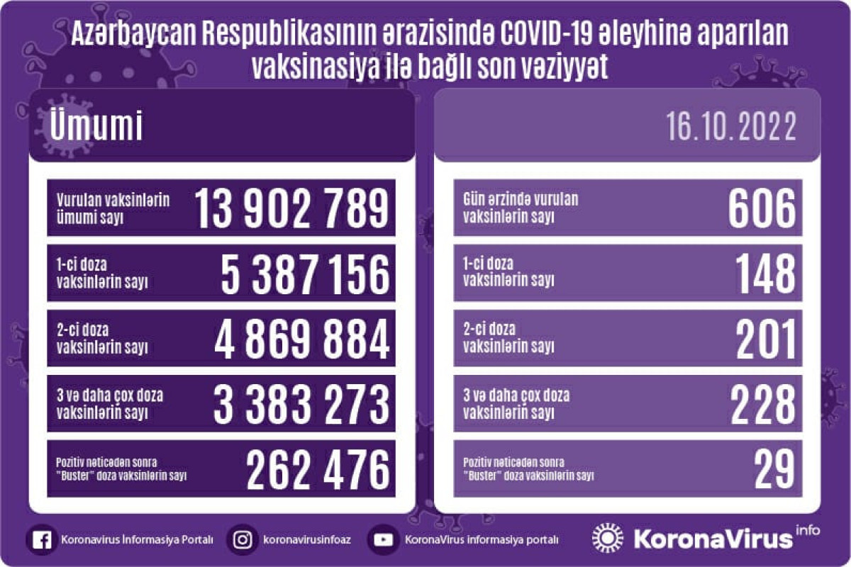 Azərbaycanda son sutkada koronavirus (COVID-19) əleyhinə 606 vaksin vurulub. Bir gündə birinci mərhələ üzrə vaksinasiya olunanların sayı 148, ikinci mərhələ üzrə vaksinasiya olunanların sayı 201, 3-cü və daha çox doza üzrə vaksinasiya olunanların sayı 228, pozitiv nəticədən sonra buster doza olunanların sayı isə 29 nəfərdir.