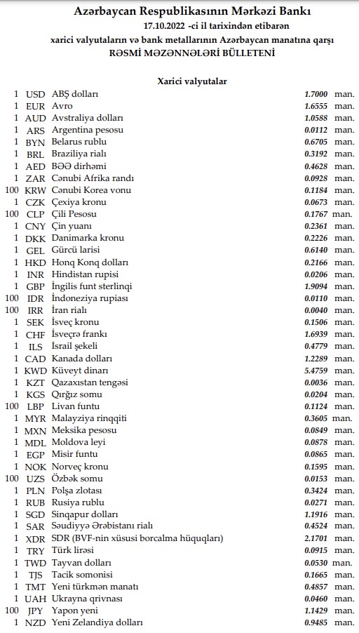 Dolların bazar ertəsi üçün rəsmi məzənnəsi müəyyən olunub