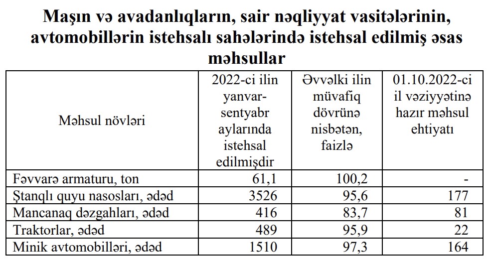 2022-ci ilin yanvar-sentyabr aylarında Azərbaycanda 1510 ədəd və ya ötən ilin müvafiq dövrü ilə müqayisədə 42 ədəd az (2,7%) minik avtomobili istehsal olunub (yığılıb).