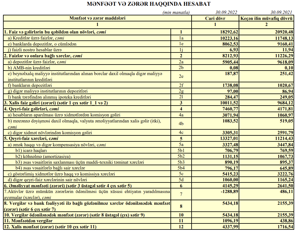 ASB-nin faiz gəlirləri 2022-ci ilin 9 ayında ötən ilin eyni dövrü ilə müqayisədə 2 milyon 628 min manat və ya 12,6% azalaraq 18 milyon 292 min manata düşüb, qeyri-faiz gəlirləri isə 3 milyon 288 min manat və ya 78,8% artaraq 7 milyon 460 min manata yüksəlib. Bankın xalis mənfəətinin artması - faiz xərclərinin azalması, qeyri-faiz gəlirlərinin artması və aktivlər üzrə mümkün zərərlərin ödənilməsi üçün xüsusi ehtiyatdan azad olan vəsaitin hesabınadır.