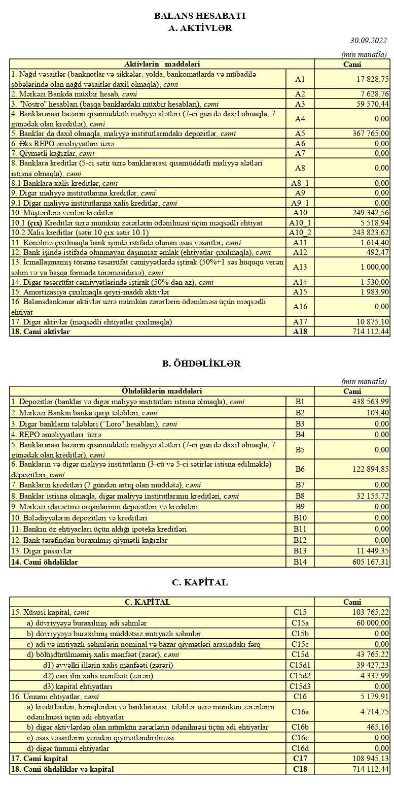 2021-ci ilin sonu ilə müqayisədə (cari ilin 9 ayında) ASB-nin cəmi aktivləri 98 milyon 449 min manat və ya 12,1% azalıb. Ötən ilin sonunda ASB-nin cəmi aktivləri 812 milyon 561 min manat təşkil etmişdi. O cümlədən, 9 ay ərzində ASB-nin banklar da daxil olmaqla, maliyyə institutlarındakı depozitləri 99 milyon 530 min manat və ya 21,3% azalıb. Müştərilərə verilmiş cəmi kreditlər isə ötən ilin sonu ilə müqayisədə 5 milyon 749 min manat və ya 2,3% çoxdur. 31 Deakbr 2021-ci il tarixində ASB-nin banklar da daxil olmaqla, maliyyə institutlarındakı depozitləri 467 milyon 295 min manat, kredit portfeli 243 milyon 593 min manat təşkil etmişdi.