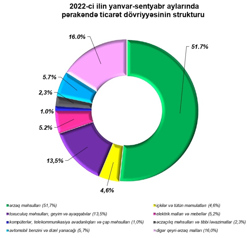 2022-ci ilin yanvar-sentyabr aylarında alıcıların pərakəndə ticarət şəbəkəsində aldıqları mallara xərclədiyi vəsaitin 51,7 faizi ərzaq məhsullarının, 4,6 faizi içkilər və tütün məmulatlarının, 13,5 faizi toxuculuq məhsulları, geyim və ayaqqabıların, 5,7 faizi avtomobil benzini və dizel yanacağının, 5,2 faizi elektrik malları və mebellərin, 2,3 faizi əczaçılıq məhsulları və tibbi ləvazimatların, 1,0 faizi kompüterlər, telekommunikasiya avadanlıqları və çap məhsullarının, 16,0 faizi isə digər qeyri-ərzaq mallarının alınmasına sərf olunmuşdur.