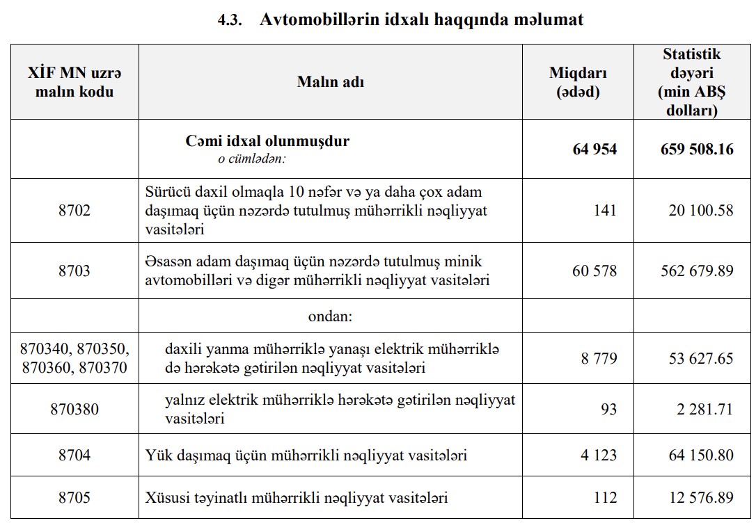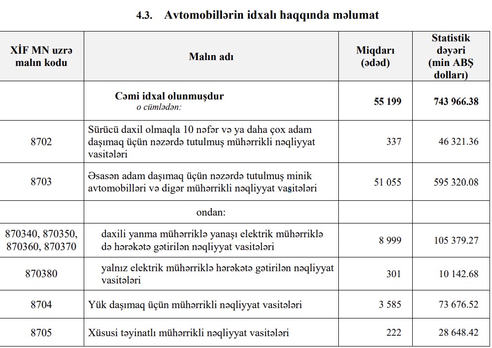 2021-ci ilin 9 ayında Azərbaycana 659 milyon 508 min dollar dəyərində 64 min 954 ədəd nəqliyyat vasitəsi idxal edilmişdi. İdxal olunan avtomobillərin sayı azalsa da, dəyiri artıb.
