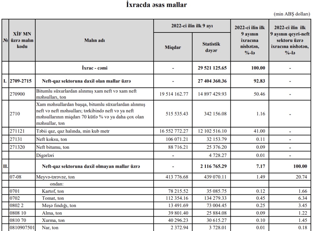 2022-ci ilin yanvar-sentyabr dövründə Azərbaycandan 14 milyard 897 milyon 430 min dollarlıq xam neft, 12 milyard 102 milyon 516 min dollarlıq təbii qaz ixrac edilib. Ötən ilin eyni dövründə Azərbaycandan 9 milyard 302 milyon 613 min dollarlıq xam neft, 2 milyard 951 milyon 453 min dollarlıq təbii qaz ixrac edilmişdi. Beləliklə, ixrac edilən xam neftin statistik dəyəri 60,1%, təbii qazın statistik dəyəri isə 4,1 dəfə artıb.