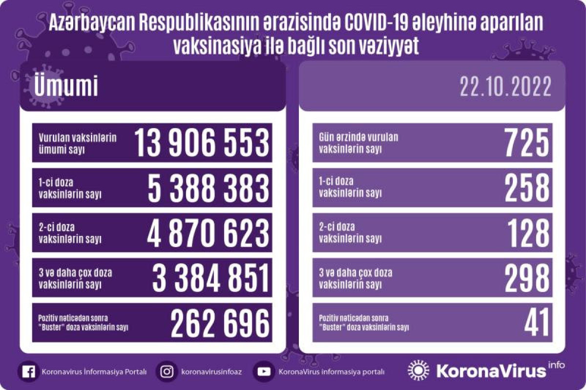 Azərbaycanda son sutkada koronavirus (COVID-19) əleyhinə 725 vaksin vurulub. Bir gündə birinci mərhələ üzrə vaksinasiya olunanların sayı 258, ikinci mərhələ üzrə vaksinasiya olunanların sayı 128, üç və daha çox doza üzrə vaksinasiya olunanların sayı 298, pozitiv nəticədən sonra buster doza üzrə vaksinasiya olunanların sayı 41 nəfərdir.