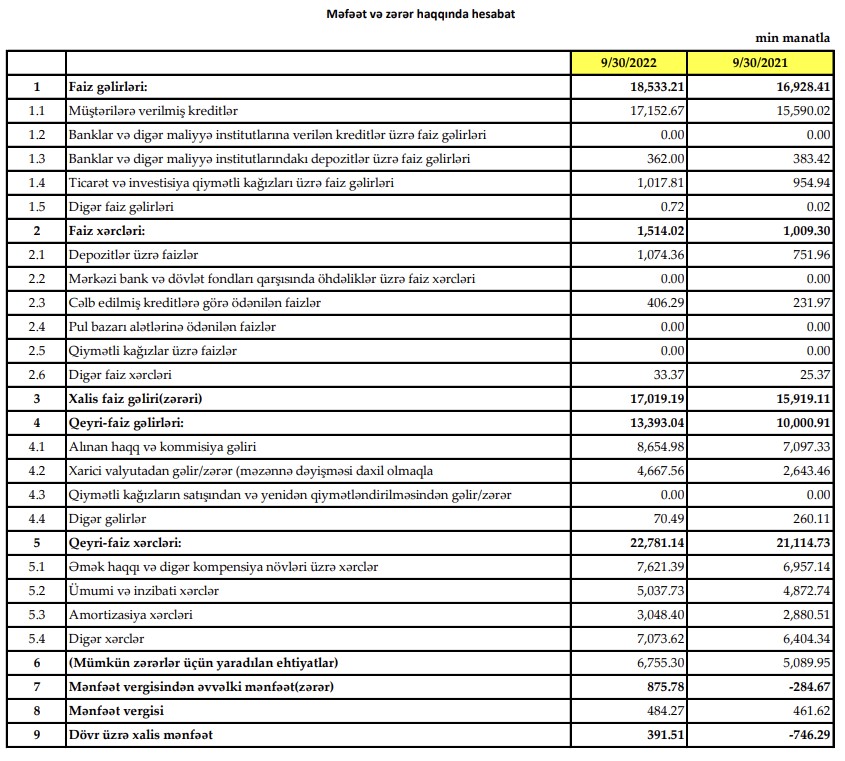 Bankın yaydığı press-relizdə bildirilir ki, keçən ilin müvafiq dövrü ilə müqayisədə faiz gəlirləri 10% artaraq 18.5 milyon manat, qeyri-faiz gəlirləri 34% artaraq 13,4 milyon manat təşkil edib. Ümumilikdə, Bank üçüncü rübü 17 milyon manat xalis faiz gəliri ilə başa vurub. Bankın xalis mənfəəti 0.4 milyon manat təşkil edib.