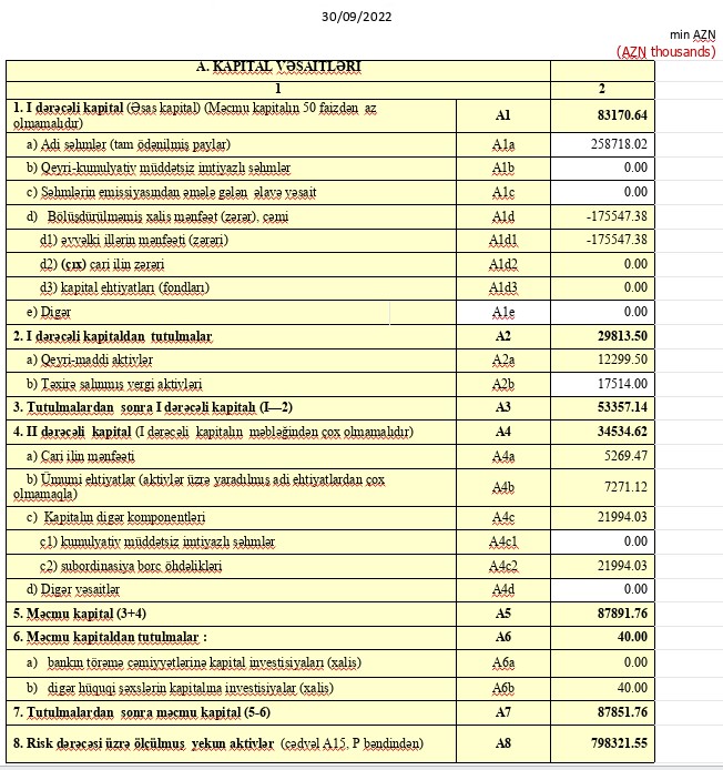 30 Sentyabr 2022-ci il tarixində "AccessBank" 87 milyon 851 min manat məcmu kapitala malik olub (31 Dekabr 2021-ci il tarixində 79 milyon 666 min manat idi).