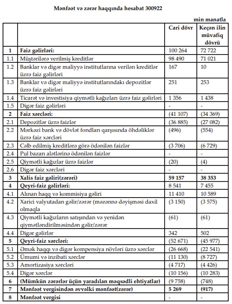 Müqayisə üçün qeyd edək ki, 2021-ci ilin 9 ayında "AccessBank"ın cəmi əməliyyat gəlirləri 80 milyon 177 min manat, cəmi əməliyyat xərcləri 80 milyon 346 min manat, xərclər gəlirləri üstələdiyindən əməliyyat zərəri 169 min manat təşkil etmişdi. Bank mümkün zərərlər üçün yaradılan məqsədli ehtiyatlara 748 min manat ayırmışdı.