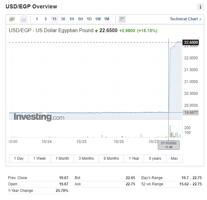 İnvesting.com-un məlumatına görə USD/EGP məzənnəsi 22,7 səviyyəsini keçib. 19,7 səviyyəsindən açılan məzənnə 22,7-yə yüksəlib (15,2% artım).