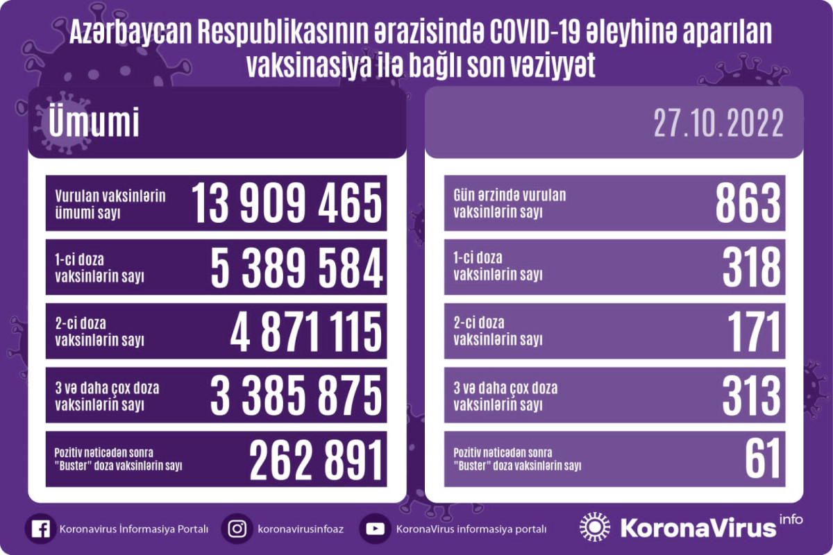 Azərbaycanda son sutkada koronavirus (COVID-19) əleyhinə 863 vaksin vurulub. Bir gündə birinci mərhələ üzrə vaksinasiya olunanların sayı 318, ikinci mərhələ üzrə vaksinasiya olunanların sayı 171, üç və daha çox doza üzrə vaksinasiya olunanların sayı 313, pozitiv nəticədən sonra buster doza üzrə vaksinasiya olunanların sayı 61 nəfərdir.