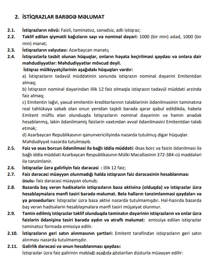 Marja.az Emissiya Prospektinə xəbər verir ki, təşkilat hər birinin nominal dəyəri 1000 manat olan 1000 ədəd faizli, təminatsız, sənədsiz, adlı istiqrazlar buraxır.