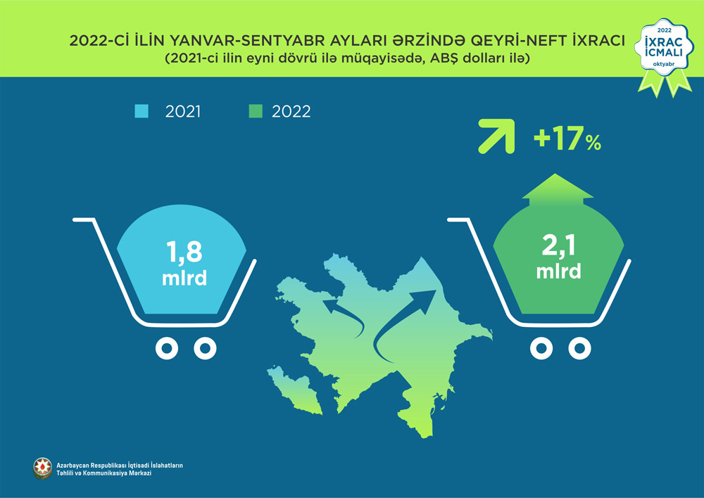 Marja.az “İxrac icmalı”nın oktyabr sayına istinadən xəbər verir ki, 2022-ci ilin yanvar-sentyabr aylarında Azərbaycanın ümumi ixracı 29,5 milyard ABŞ dolları, qeyri-neft sektoru üzrə ixrac 2,1 milyard ABŞ dolları təşkil edib. Qeyri-neft sektoru üzrə ixrac 2021-ci ilin doqquz ayı ilə müqayisədə 17% artıb.
