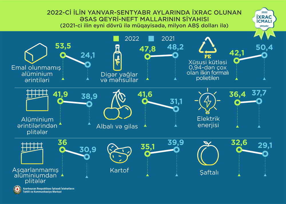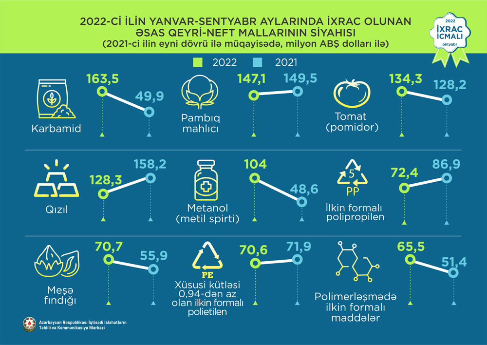 2022-ci ilin yanvar-sentyabr ayları ərzində ixrac edilən qeyri-neft sektoruna aid malların siyahısında karbamid (163,5 milyon ABŞ dolları) birinci olub. Bu siyahıda pambıq mahlıcı (147,1 milyon ABŞ dolları) ikinci, tomat (pomidor) (134,3 milyon ABŞ dolları) isə üçüncü yerdə qərarlaşıb.