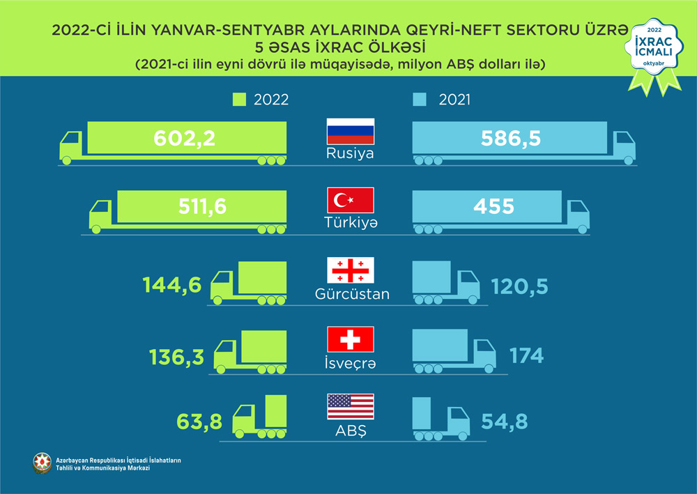 2022-ci ilin yanvar-sentyabr ayları ərzində Rusiya Federasiyasına 602,2 milyon ABŞ dolları, Türkiyəyə 511,6 milyon ABŞ dolları, Gürcüstana 144,6 milyon ABŞ dolları, İsveçrə Konfederasiyasına 136,3 milyon ABŞ dolları və ABŞ-a isə 63,8 milyon ABŞ dolları dəyərində qeyri-neft sektoruna aid mal ixrac olunub.