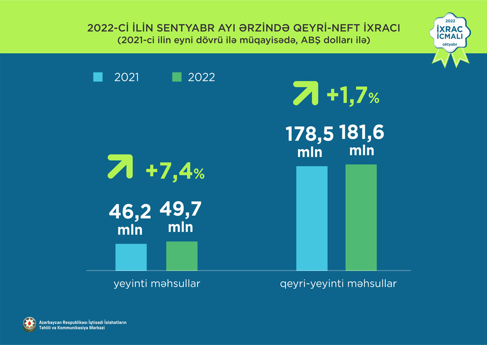 2022-ci ilin sentyabr ayı üzrə ixrac 3,3 milyard ABŞ dolları, qeyri-neft sektoru üzrə ixrac isə 231,2 milyon ABŞ dolları təşkil edib. 2022-ci ilin sentyabr ayı ərzində yeyinti məhsulları üzrə ixrac 7,4% artaraq 49,7 milyon ABŞ dolları, qeyri-yeyinti məhsulları üzrə isə 1,7% artaraq 181,6 milyon ABŞ dollarına bərabər olub.