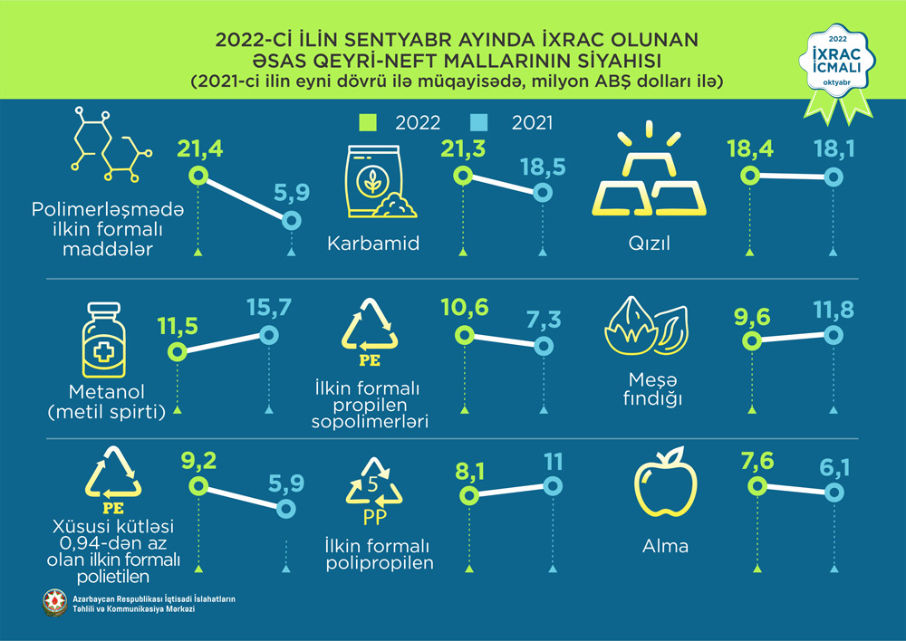 2022-ci ilin sentyabr ayında ixrac edilən qeyri-neft sektoruna aid malların siyahısında polimerləşmə nəticəsində əmələ gələn ilkin formalı digər maddələr (21,4 milyon ABŞ dolları) birinci, karbamid (21,3 milyon ABŞ dolları) ikinci və qızıl (18,4 milyon ABŞ dolları) üçüncü olub.