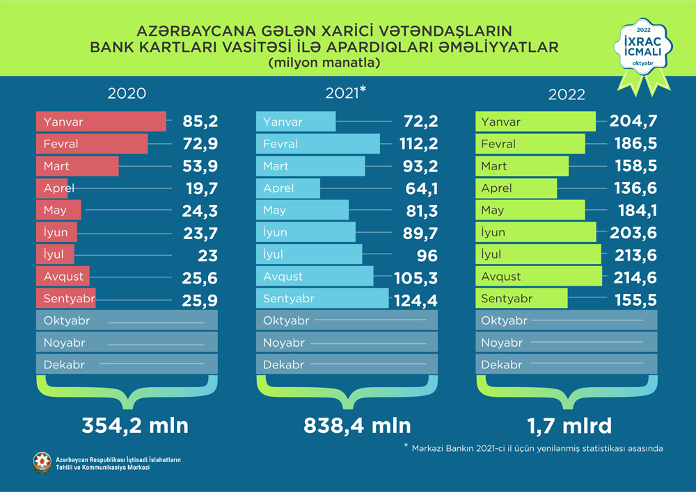 Qeyd edilib ki, 2022-ci ilin yanvar-sentyabr aylarında isə əcnəbilər bank kartları vasitəsi ilə 1,7 milyard manatlıq əməliyyat aparıblar.