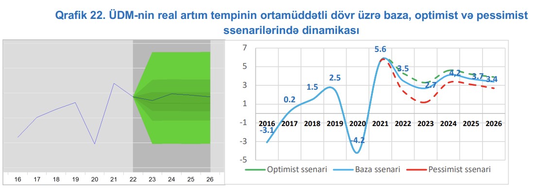 Bununla yanaşı, təqdim olunan məlumatlara əsasən 2022-2026-cı illərdə ÜDM-nin ortaillik artım tempi baza/hədəf ssenaridə 3,5 faiz, optimist ssenaridə 4,1 faiz, pessimist ssenaridə 2,6 faiz gözlənilir.