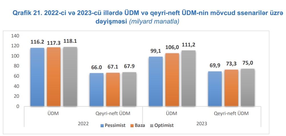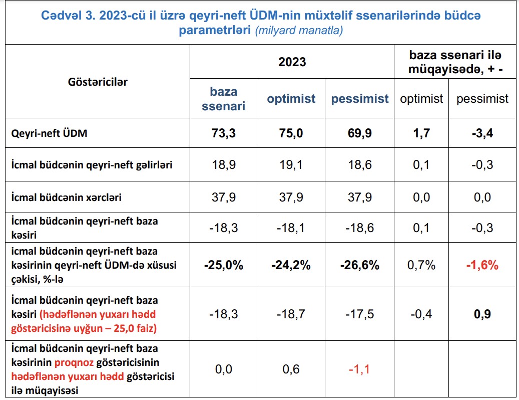 Təqdim olunan məlumatlara əsasən ÜDM-nin artım tempi 2023-cü ildə baza (hədəf) ssenarisində 2,7 faiz və ya 106,0 milyard manat gözlənilir. Baza (hədəf) ssenarisi ilə müqayisədə optimist ssenaridə 3,3 faiz (0,6 faiz-bənd çox) və ya 111,2 milyard manat (5,2 mlrd. manat çox), pessimist ssenaridə isə 1,3 faiz (1,4 faiz-bənd az) və ya 99,1 milyard manat (6,9 milyard manat az) təşkil edəcəkdir.