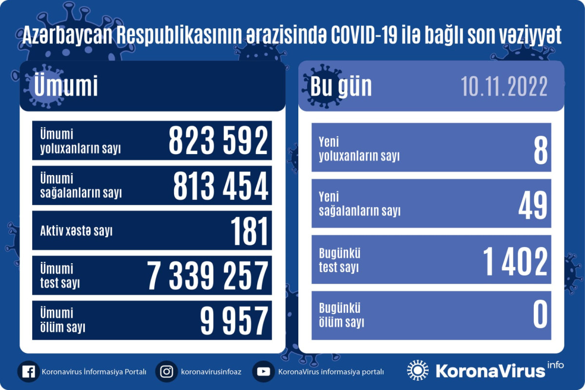 Azərbaycan Respublikasında koronavirus (COVID-19) infeksiyasına 8 yeni yoluxma faktı qeydə alınıb, 49 nəfər müalicə olunaraq sağalıb.